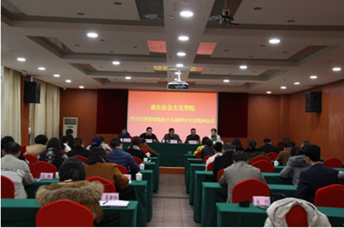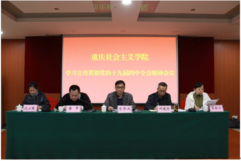 11月27日,重庆社院召开全院大会,专题学习传达党的十九届四中全会精神。副院长肖泽成主持会议并提出要求;副院长何晓栋传达学习贯彻党的十九届四中全精神和市委五届七次全会精神;副院长唐平传达学习市委常委、统战部部长,重庆社会主义学院院院长李静关于十九届四中全会的宣讲提纲;副院长吴红宁宣读院党组《关于学习宣传贯彻党的十九届四中全会精神的通知》。
