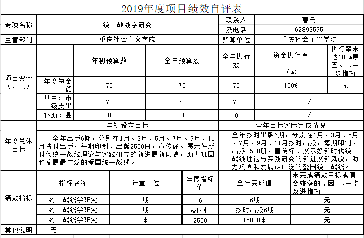 根据预算绩效管理要求,本部门对4个项目开展了绩效自评。其中,以填报目标自评表形式开展自评4项,涉及资金257万。从评价情况来看,本年度财政资金全部到位,保障了教学、科研、《统一战线学研究》期刊出版等重点工作的推进,实现了预期绩效目标。在各项目实施过程中,本部门建立健全相关制度,提高预算执行的及时性、规范性和安全性,项目资金实行专项管理、严格审批制度、做到专款专用,确保项目资金切实为推进统一战线学术研究服务、为高质量开展统一战线教育培训和社院工作服务、为巩固和发展最广泛的爱国统一战线服务,实现了项目资金的有效利用。
