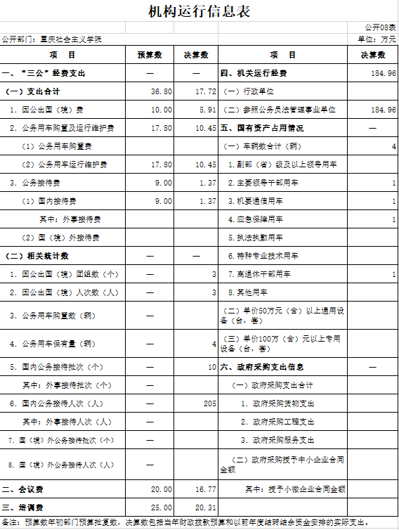 4.公务接待费1.37万元,主要用于中央社院及其他省社院来渝调研等工作接待。较年初预算数减少7.63万元,下降84.78%,主要原因是强化公务接待支出管理,严格遵守公务接待开支范围和开支标准,严格控制陪餐人数,应由接待对象承担的费用一律由接待对象自行支付,故预算公务接待费下降。较上年支出数增加0.48万元,增长53.93%,主要原因是接待批次人数较上年增加。